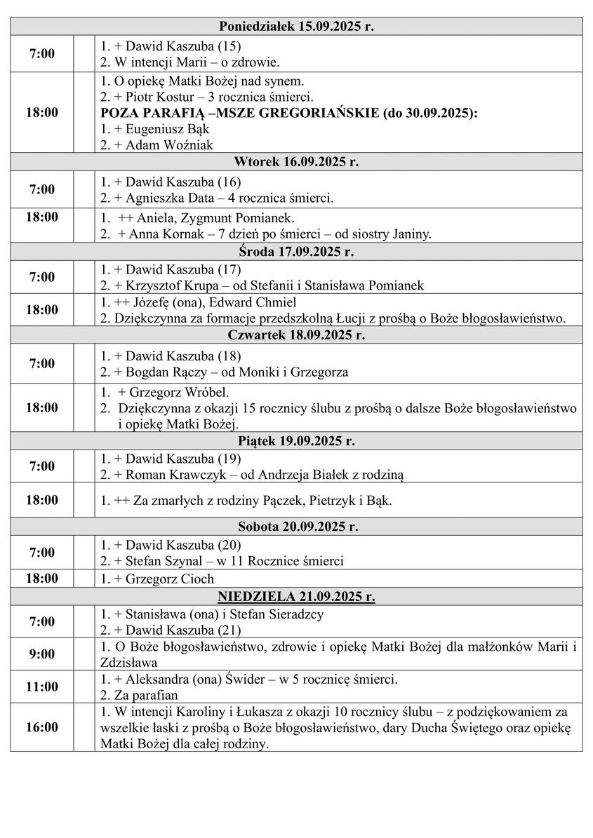 Poniedziałek 18.08.2025 r. 7.00 +Marta Cyło - 30. dzień po śmierci 18.00 ++Tekla i Walenty Koryl Wtorek 19.08.2025 r. 7.00 ++Eugenia i Emil Kaszuba 18.00 ++Emilia, Paweł Micał i +Kazimierz Oleksy Środa 20.08.2025 r. 7.00 +Ferdynand Byjoś - 5. rocznica śmierci 18.00 +Grzegorz Cioch Czwartek 21.08.2025 r. 7.00 ++Jan i Agata Rączy 18.00 +Mieczysław Głaś Piątek 22.08.2025 r. 7.00 +Eugenia Przywara - 21. rocznica śmierci 18.00 +Zbigniew Stręczek - 30. dzień po śmierci Sobota...