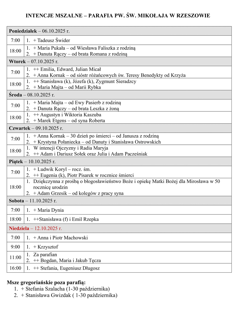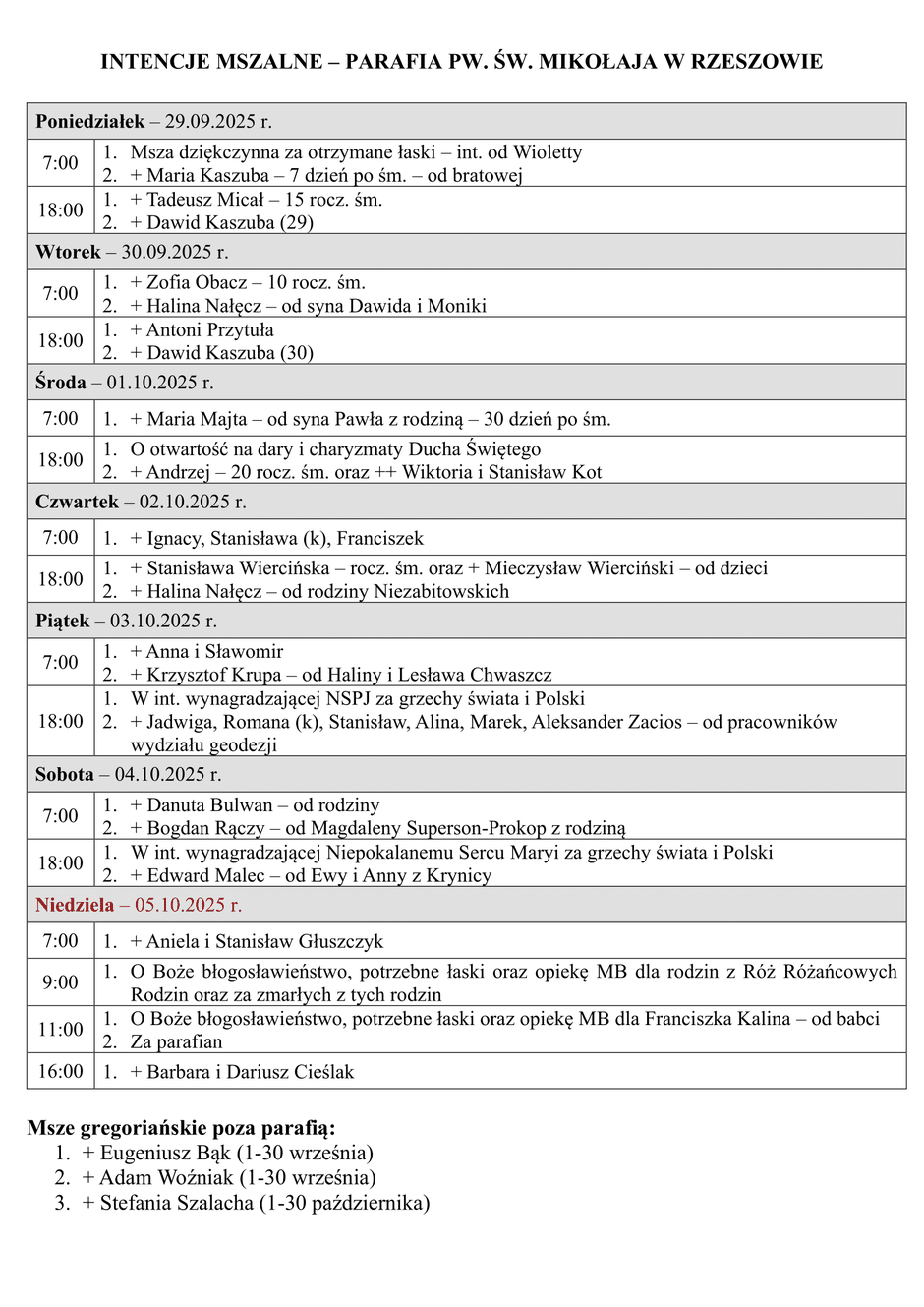 Intencje Mszalne – Parafia Pw. św. Mikołaja w Rzeszowie Poniedziałek - 22.09.2025 r. 7:00 1. ++ Marian i Janina Kidacka – od córki Marzeny 2. + Danuta Rączy – 30 dzień po śm. – od Ani 18:00 1. + Kazimierz Sala 2. + Dawid Kaszuba (22) Wtorek - 23.09.2025 r. 7:00 1. + Zmarli z rodziny Rączy 2. + Dawid Kaszuba (23) 18:00 1. + Emil Kostur 2. ++ Franciszek i Anna Sebzda i zmarli z ich rodzin Środa - 24.09.2025 r. 7:00 1. + Józef Ważny – od rodziny 18:00 1. Msza dziękczynna w...